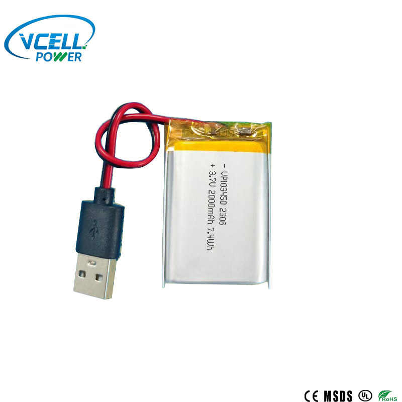 1.3.7V 2000mAh 103450 Li polimer akkumulátor nagy energiasűrűséggel, hosszú élettartammal.